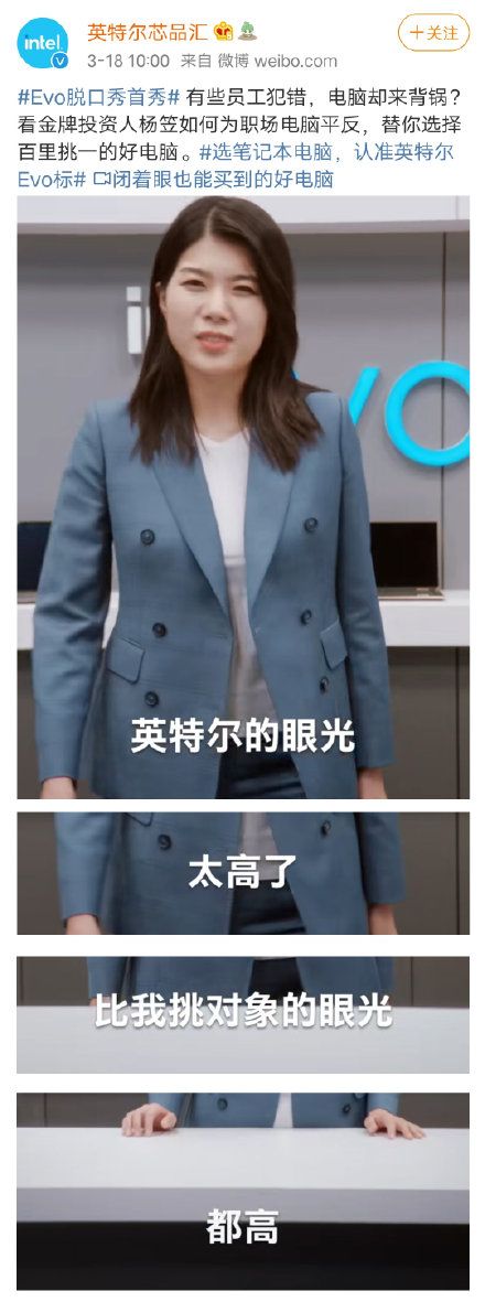 2021年3月18日,英特尔芯品汇发布杨笠宣传英特尔笔记本电脑的相关内容,并配上“看金牌投资人杨笠如何为职场电脑平反”的文案。