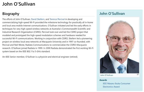 现代Wi‑Fi的核心技术来自澳大利亚CSIRO团队,其主导者为约翰·沙利文(John O’Sullivan,男)博士。是他们的技术直接构成了现代高速Wi‑Fi的核心,并被写入全球标准。